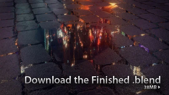 If you rendered now you would see a result similar to this. Notice the subtle sheen off the tiles and the puddles? Perfect :)