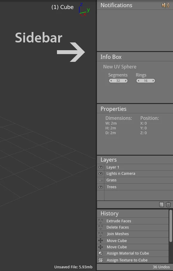 A bar situated to the right that's designed to help the user understand and interact with their scene better. Also gives developers more room to add custom tools.
