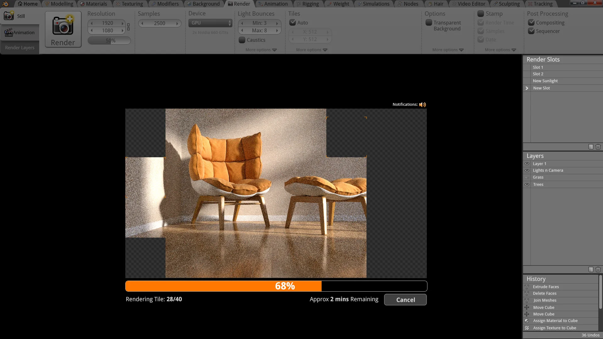Whilst rendering a progress bar with time remaining is shown (giving user more feedback). Along with a physical cancel button to remove the Esc key button mashing to stop a render.