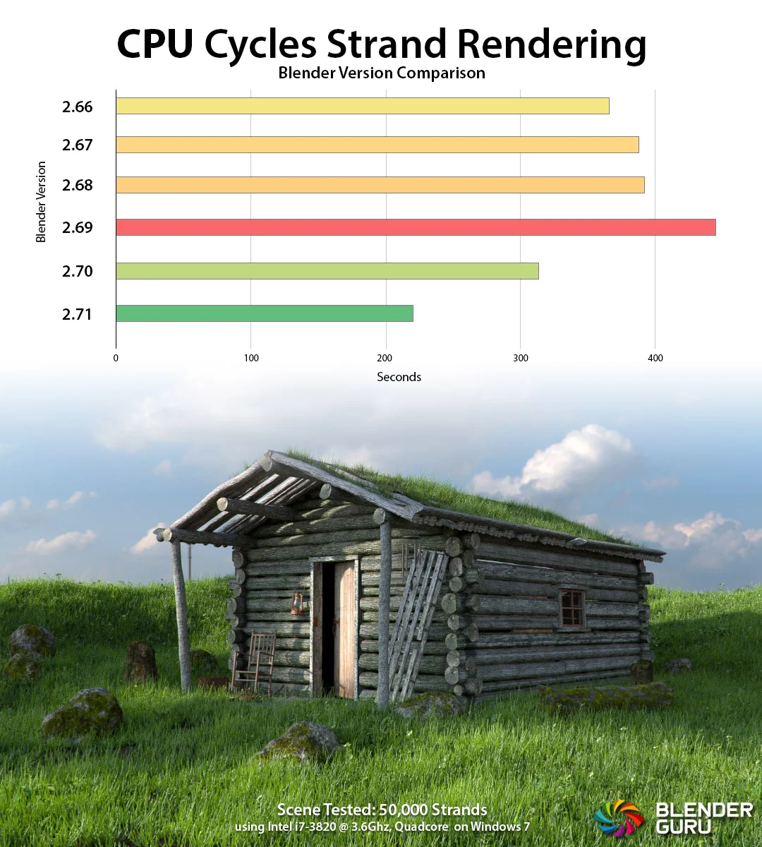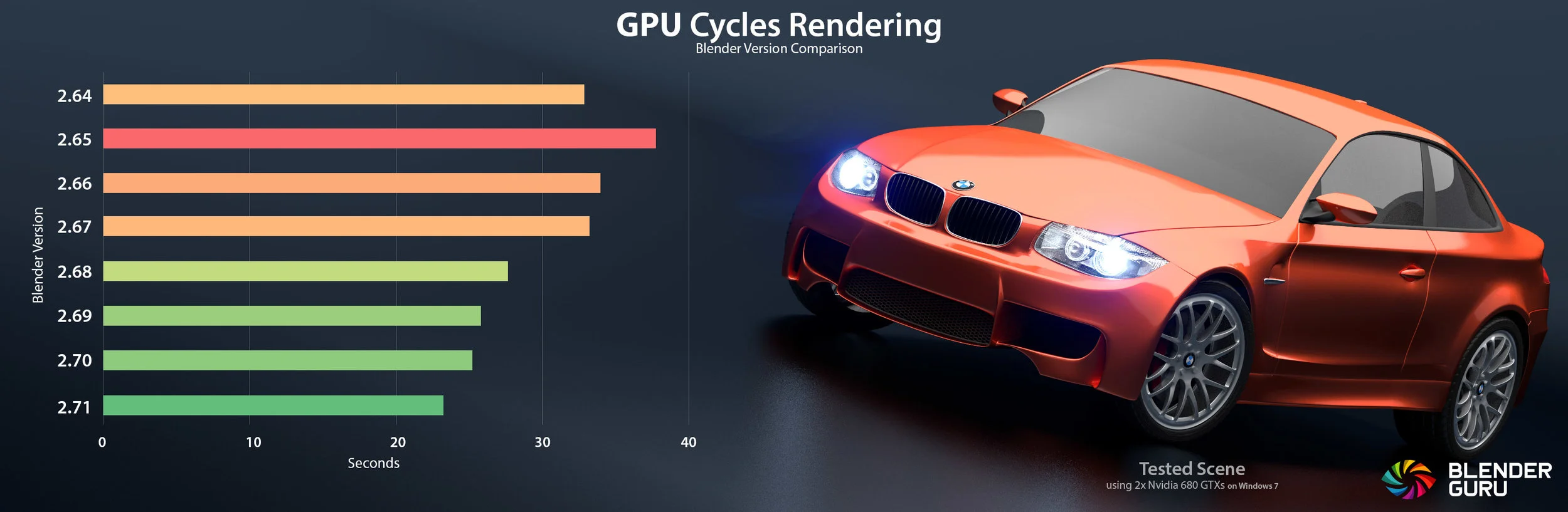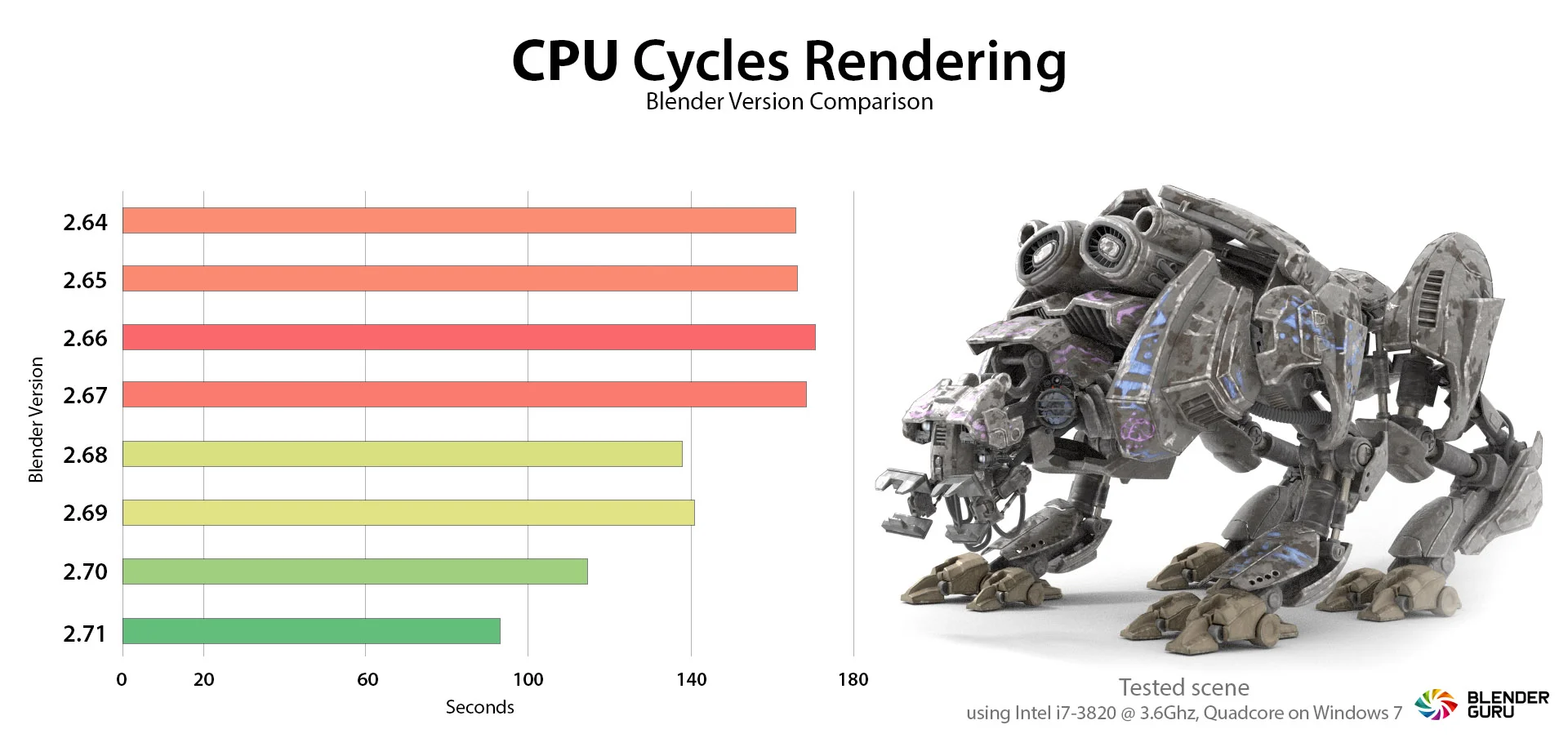 In fact, it's almost twice as fast as it was two years ago. I tested 3 different scenes on the same computer, using both CPU and GPU - and compared the results with the last 8 versions of Blender.