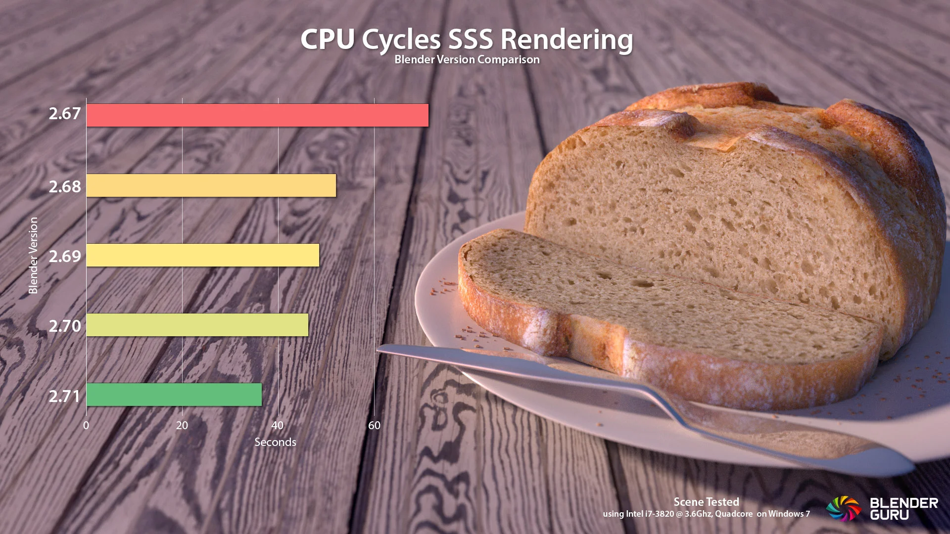 Another new feature is Subsurface Scattering (SSS), introduced in May 2013. It's currently only supported on the CPU, so only one test here: